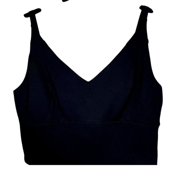 Sleek black crop top from Cabi, ready to elevate any ensemble. Featuring a flattering V-neckline and a minimalist, sleeveless design, this top offers a clean and contemporary silhouette. The structured bodice and adjustable straps ensure a comfortable and customized fit. Perfect for layering under a blazer at the office, pairing with jeans for a casual weekend outing, or dressing up with a skirt for an evening event.